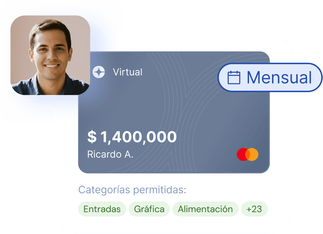 Asigna una tarjeta para cada colaborador, con límites y categorías personalizados. Al momento del gasto, reporta directamente desde la App.
