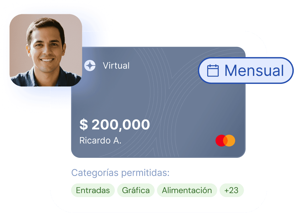 Asigna una tarjeta para cada colaborador, con límites y categorías personalizados. Al momento del gasto, reporta directamente desde la App.